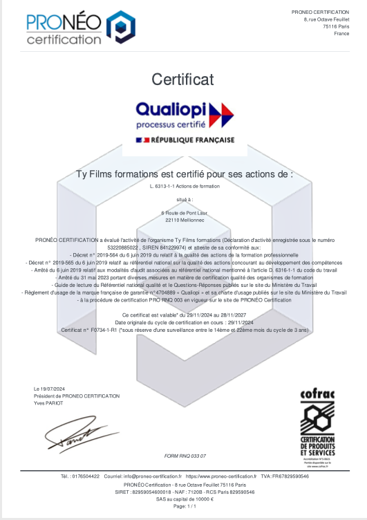 – Une personnalité référente, le parrain / la marraine, différente chaque année. Le rôle de cette personne sera d’une part, de définir la ligne éditoriale en proposant des professionnel·les de son réseau comme intervenant·es dans le programme pré-établi par Ty Films et d’autre part, d’accompagner les stagiaires dans leurs projets personnels. Il ou elle devra avoir une bonne connaissance des trois métiers. L’accompagnement de cette personne tout au long de la formation donnera une couleur à la promotion et vise à élargir le carnet d’adresse des stagiaires.